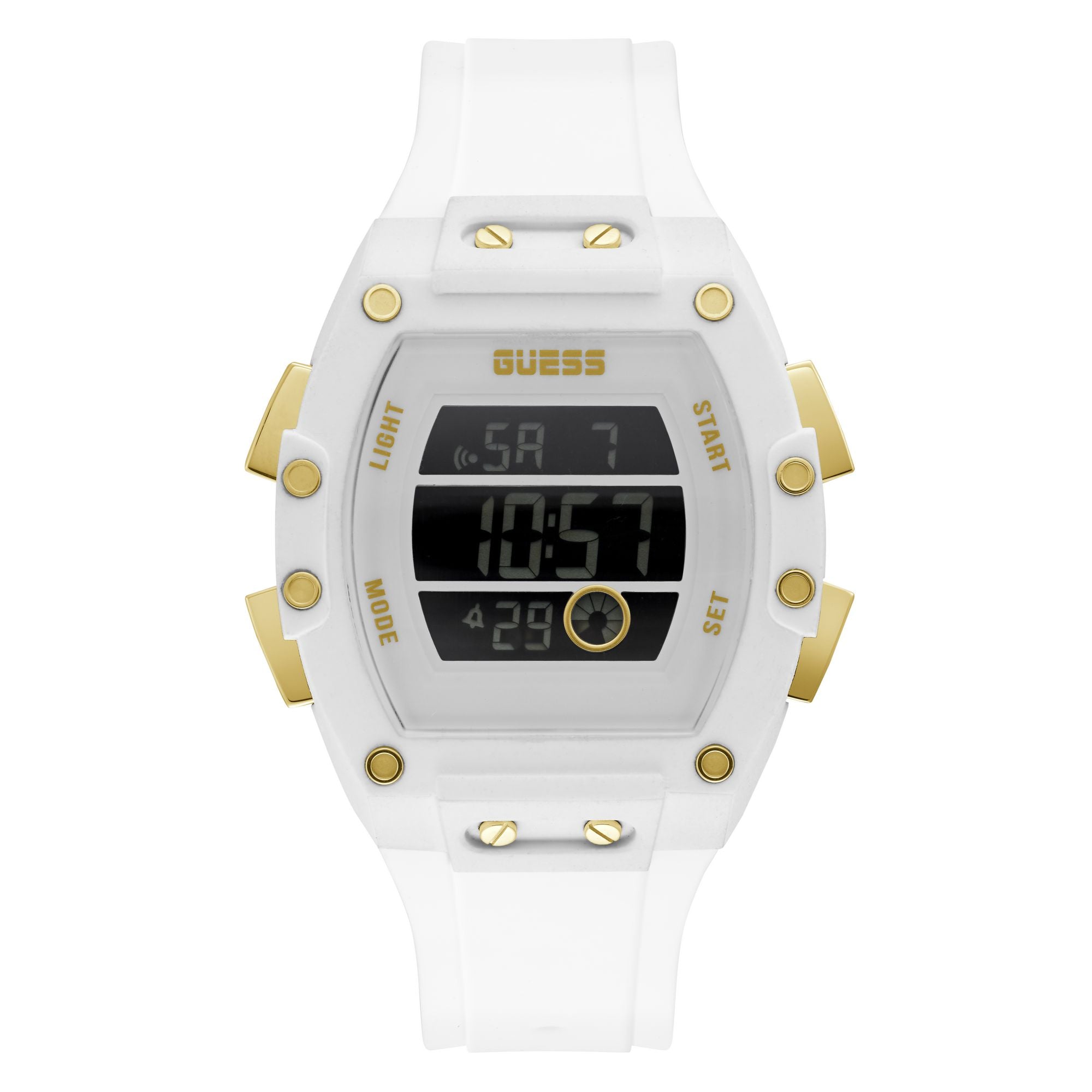 The dial is black with a digital display which is split into segments to show time, date, day and mode indicators. The Guess logo sits up top while the rest of the layout keeps things symmetrical and clean. The side buttons (Light, Mode, Start, Set) make switching functions a breeze.
