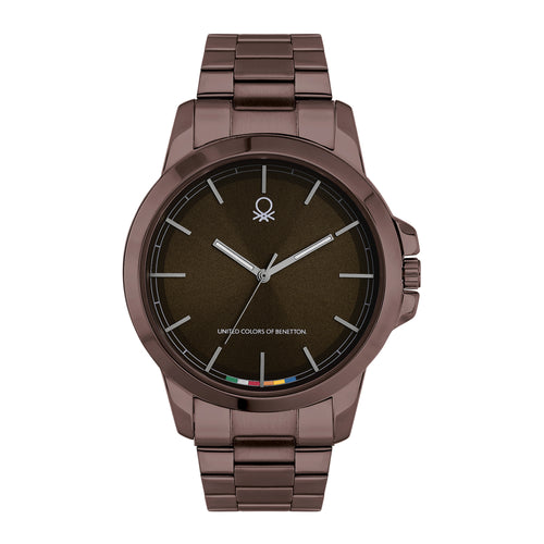 Ideal for stylish men, this analog watch from the Signature collection by United Colors of Benetton is sure to impress you. Its stainless steel strap showcases a brown hue that uplifts the look of the watch. Functional on a quartz movement and protected by a mineral glass, the brown round dial is housed in a 44 mm case. It displays plain three hands. Besides, it is completed with a push-button clasp to ensure a secure fit on the wrist.