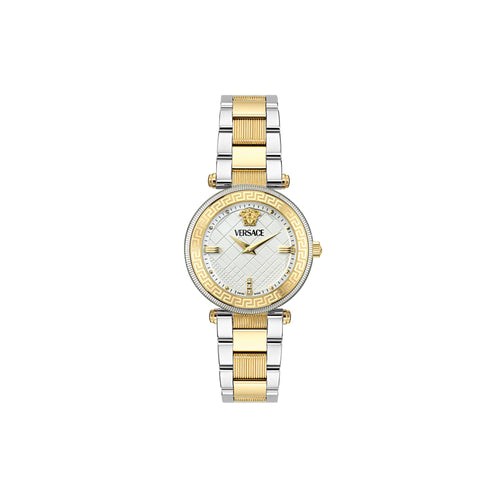 This new iconic case recalls the famous patterns used in the Versace accessories. The matelassé effect on dial, the enameled Greca decorating the top ring and the Medusa on the metal loop, they all give a strong personality to this watch collection. To flag the Caramel leather strap version, in line with the latest RTW colors.