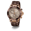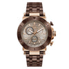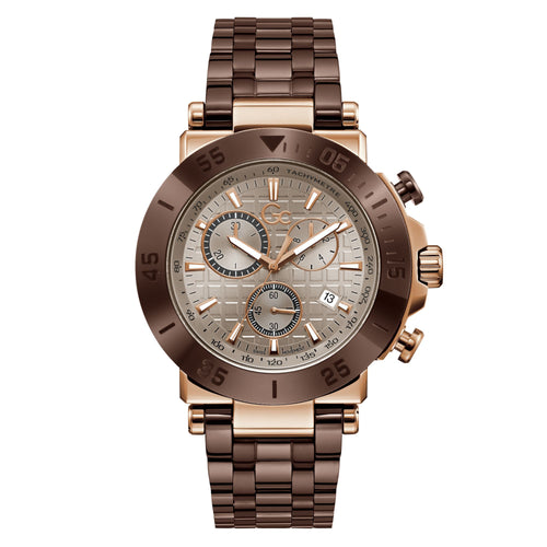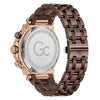 Impose yourself with this oversize modern take on the most iconic Gc chronograph, its brushed and polished rose gold tone case with warm brown PVD bezel, earthy beige checkered guilloche dial with tachymeter and three sub-counters, and warm brown PVD metal bracelet with deployment buckle.