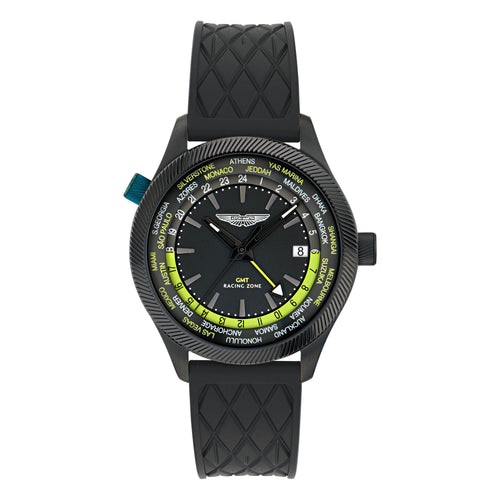 Your world, on time.Built for global travelers, this GMT watch features a black dial with lime essence and grey 24-hour markers and dual-time tracking. It's offered with an IP black recycled steel case and the double injection black and lime essence silicone strap echo Aston Martin’s racing interiors. It’s sleek, functional, and engineered for movement.