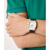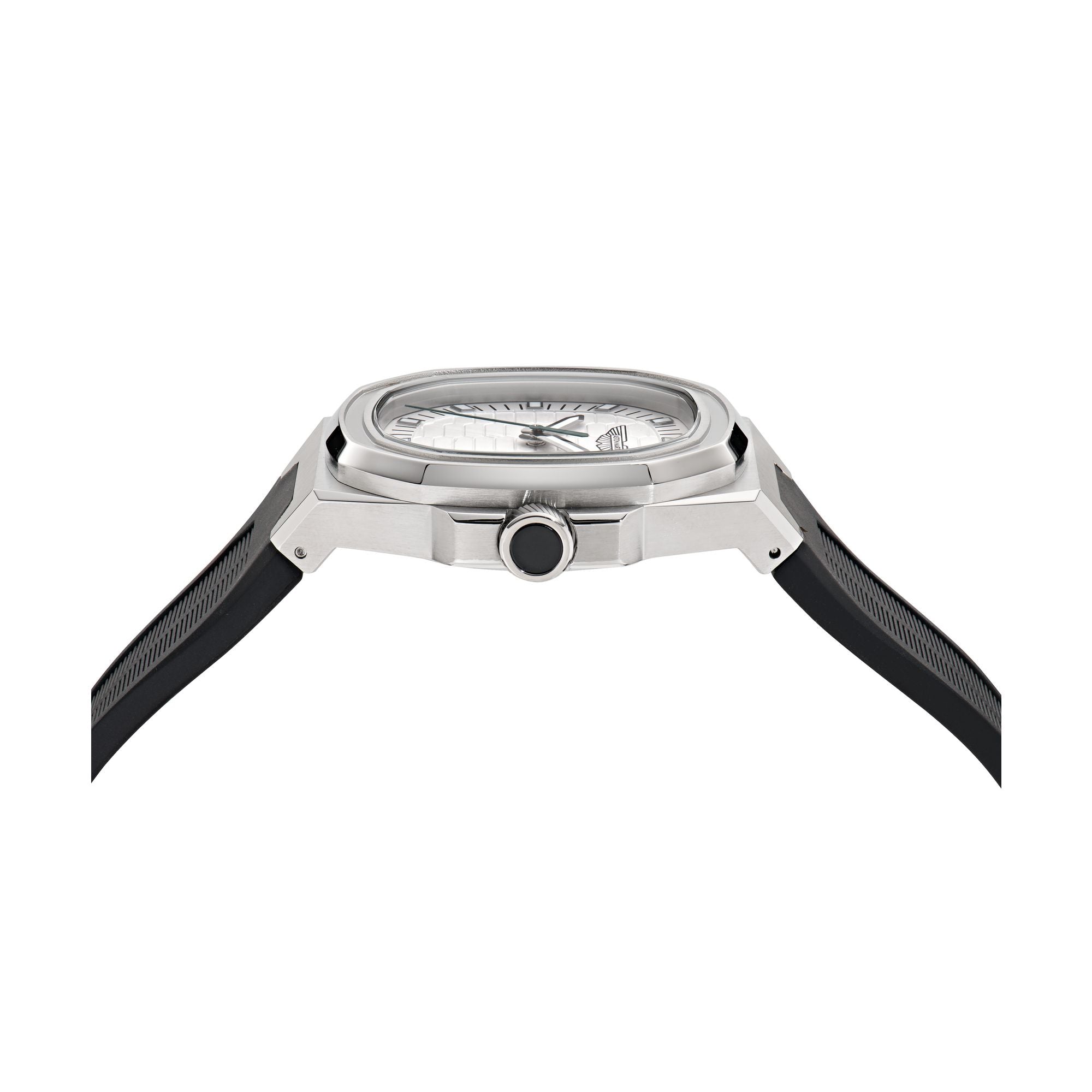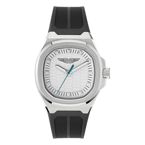 Everyday versatility with a bold twist. This GPQ style features a silver dial framed by a 40mm recycled stainless steel case and matched with a dual-injection strap in black and light brown. The Aston Martin Wings logo on the dial adds heritage, while the strap offers modern contrast and everyday comfort.