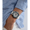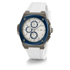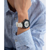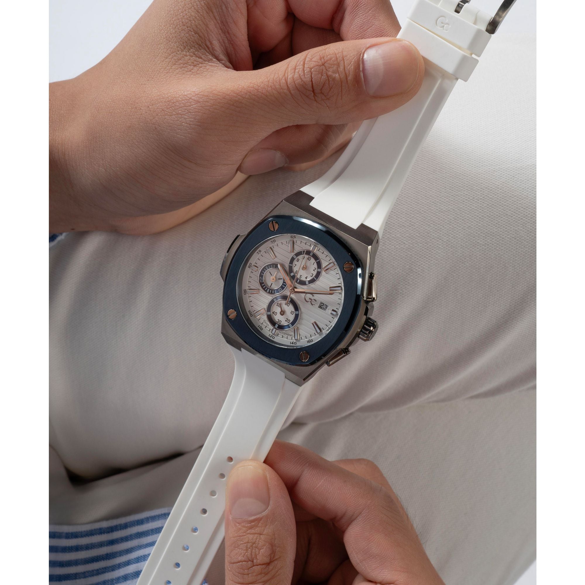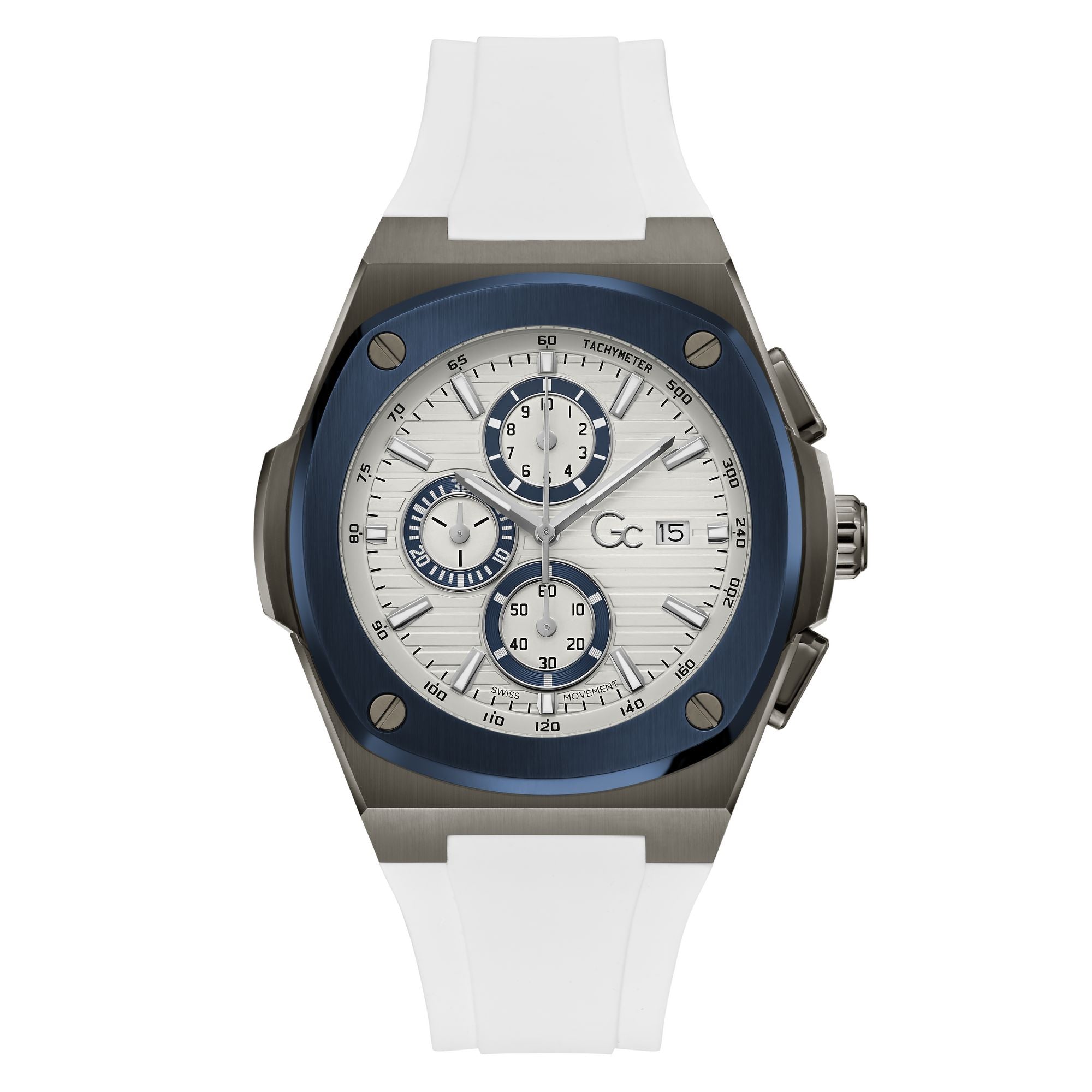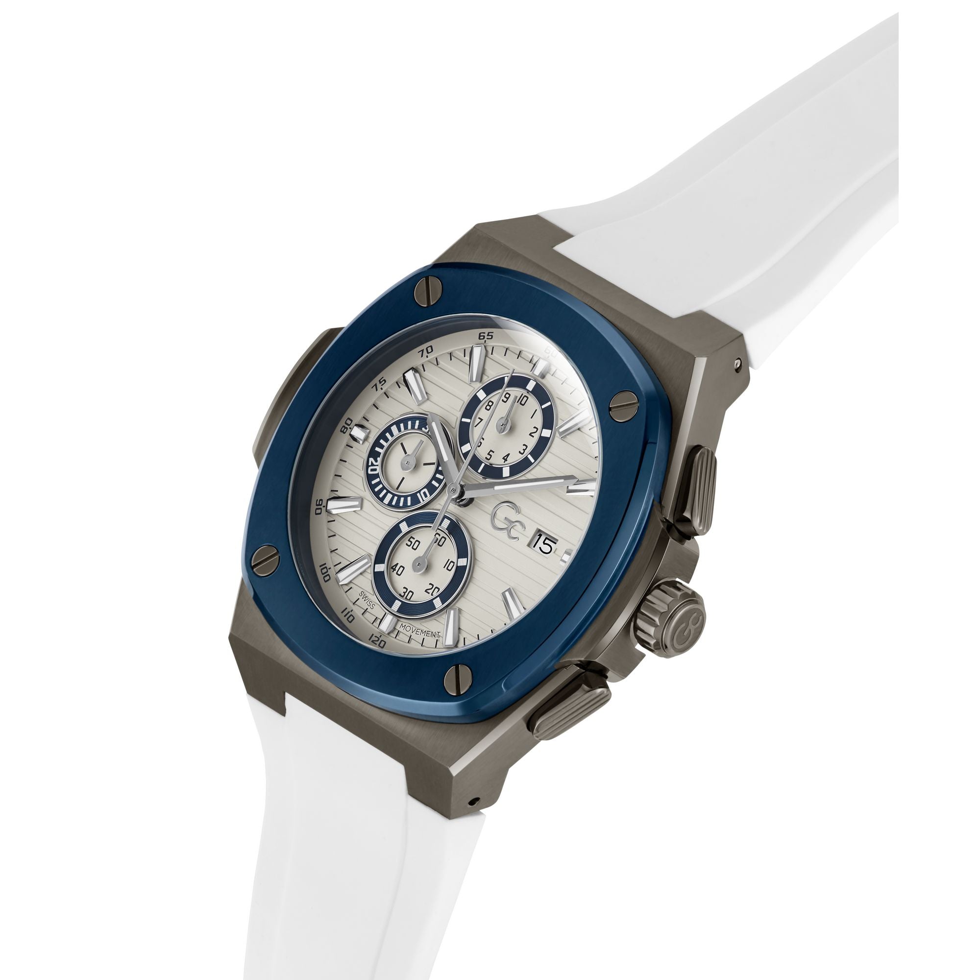Bold styling and strong character define the male version of the Gc Coussin Shape. Featuring a 44mm case and a highly detailed white striped pattern dial, this chronograph exudes a premium horological mastery. The screw design details on the bezel harmonize with the yachting aesthetic, while the gun and ocean blue two-tone case and the white silicone strap create a striking look tailored for the fashion-conscious man of today.