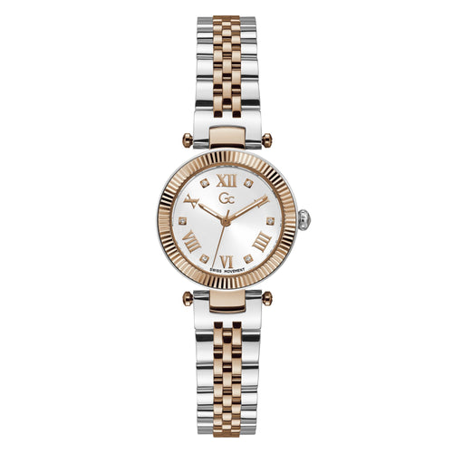 Add a touch of refinement to your everyday wardrobe with the Gc Flair petite size. It has a distinctive notched bezel and a comfortable, supple, five links bracelet and, for the two tone version, an eye-catching sunray white dial with roman numbers and crystal indices