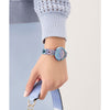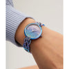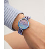 This underwater-inspired look features a full glitter dial with a crystal, coral-like patterned bracelets. Self-adjustable g-links make this piece easy to size.