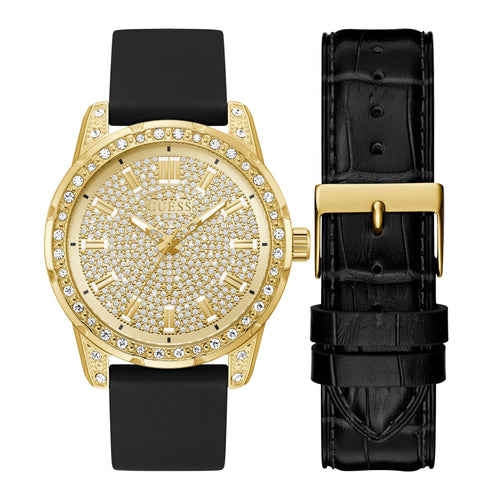 This Guess Box Set watch features a 46mm champagne dial, offering a timeless and sleek design for modern men. With its analog display, this watch provides accurate timekeeping in a stylish and effortless manner.