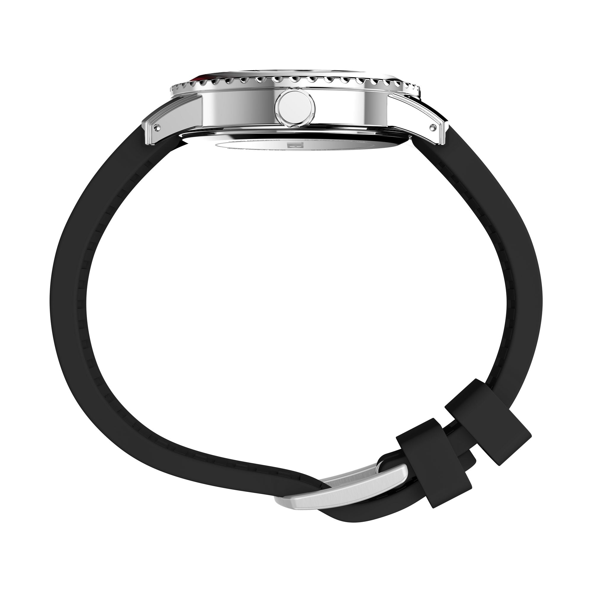 This watch is crafted around a rugged 41mm stainless-steel case with a top ring that captures the tactical aesthetic of a true diver watch. Its dial, available in classic black, showcases raised Arabic numeral markers gracing the 12 and 6 o’clock positions, accompanied by a discreetly positioned date window at 3 o’clock. Enhancing its appeal is a textured silicone strap in black and 30m of water resistance.