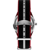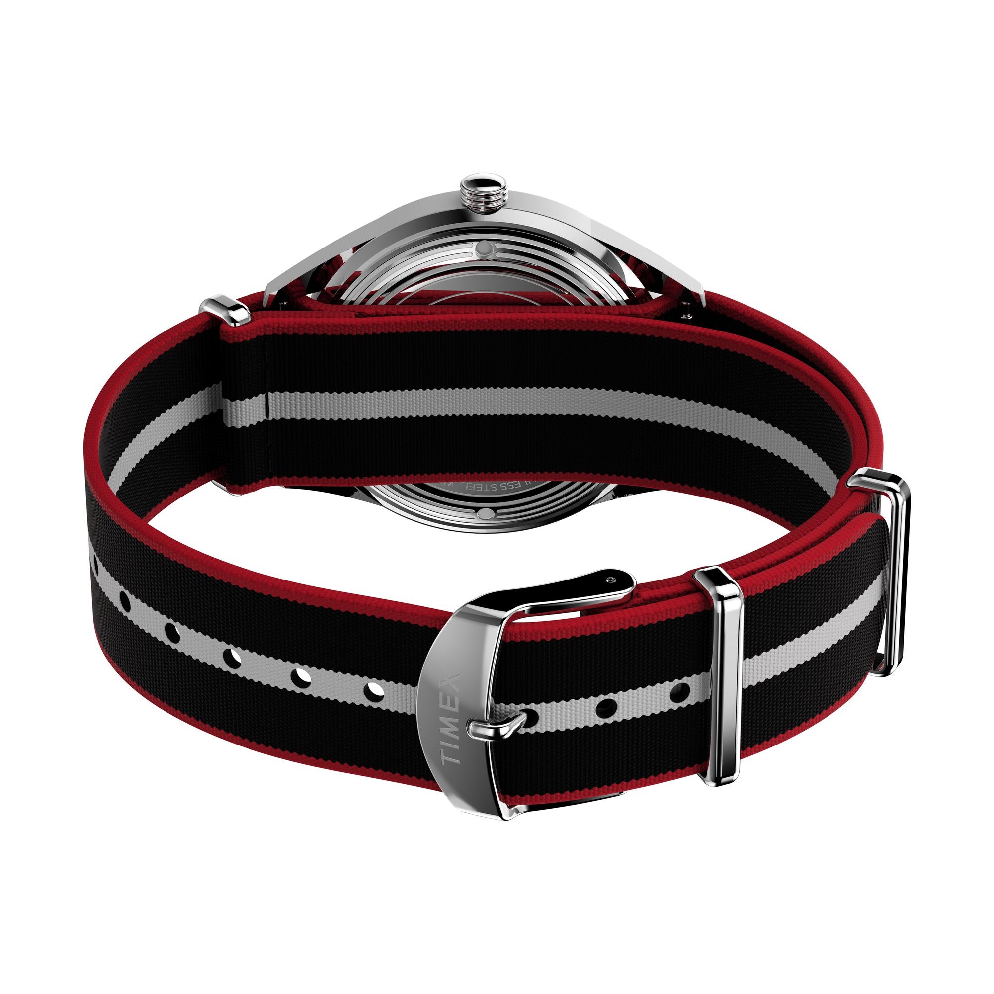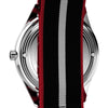 Our Marlin Jet captures futuristic design ideals of the ‘60s with understated details and a sleek 38mm brushed stainless-steel case. However, its most defining feature is the domed crystal. Made from Hesalite—a refined form of acrylic favored for its clarity and ease of maintenance—the crystal covers the entire top surface of the watch case, enveloping the grooved bezel bearing the Marlin name and bringing captivating depth to the watch's retro-futuristic appearance. It blends seamlessly into the flat case sides, leaving only the lugs exposed. The case sides smoothly transition to a screwed-on case back that mirrors the crystal’s domed contour, enhancing the watch’s streamlined profile and space-age aesthetics. You’ll find a concentric circle pattern in three key locations on this timepiece: beneath the dome on the inner bezel, on the crown, and on the case back. The silver, blue, or green matte concave dial showcases a crosshair pattern punctuated with a day and date window beside the 3 o’clock marker, and we’ve paired this timepiece with a double-layered recycled fabric slip-thru strap that introduces a more casual element to its clean design.