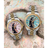 The dial shimmers in either pink or blue-green mother-of-pearl sourced from the delicate lining of mollusk shells. At its center lies a divinely feminine mosaic design.