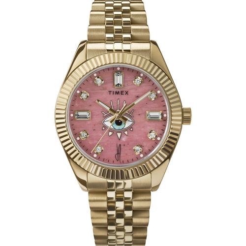 The dial features natural rhodochrosite, a gemstone believed to inspire love and healing, accented with Austrian crystal indices and Jacquie’s signature tribe eye motif.