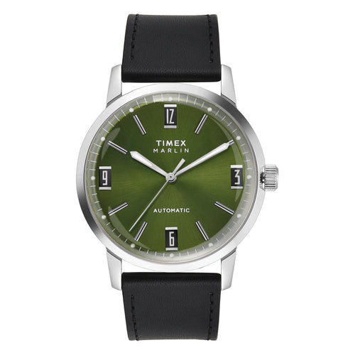 Ticking inside this iteration of our iconic 1960s Marlin® is a tried-and-true 21-jewel automatic movement, creating a contemporary timepiece that honors our watchmaking history. Powered by your motion as you wear the watch, the movement can store a maximum 40 hours of energy. If motionless longer than 40 hours, wind the watch using the crown until you feel resistance, set the time, and place it back on your wrist where every motion will supply the energy. True to our original Marlin design, this watch features the iconic domed acrylic crystal, complemented by a stainless-steel case, green dial, and classic black leather strap sourced from the S.B. Foot Tanning Company.