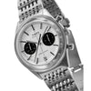 Our Marlin Jet Quartz Chronograph captures futuristic design ideals of the ‘60s with understated details and a sleek 40mm brushed recycled stainless-steel case. However, its most defining feature is the domed crystal. Made from Hesalite—a refined form of acrylic favored for its clarity and ease of maintenance—the crystal covers the entire top surface of the watch case, enveloping the grooved bezel bearing a tachymeter index and bringing captivating depth to the watch's retro-futuristic appearance. It blends seamlessly into the flat case sides, leaving only the lugs exposed. The case sides smoothly transition to a screwed-on case back that mirrors the crystal’s domed contour, enhancing the watch’s streamlined profile and space-age aesthetics. You’ll find a concentric circle pattern in two key locations on this timepiece: beneath the dome on the inner bezel and on the case back. The silver-tone concave dial showcases contrasting sub-dials and a date window beside the 6 o’clock marker. Completing the look is a brushed and polished recycled stainless-steel 6-link bracelet.