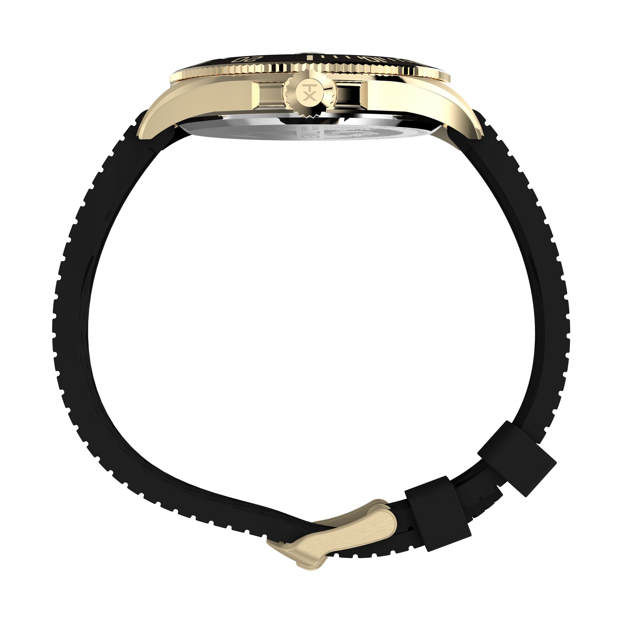 This diver-inspired timepiece is both polished and rugged, built with a sturdy 44mm brushed and polished case equipped with a unidirectional rotating top ring. It stands out on the wrist with a green sunray dial and a black textured synthetic rubber strap that’s perforated for enhanced breathability in and out of the water. Powering it is a reliable quartz movement, and we’ve equipped it with 100m of water resistance, a sturdy crown protector, a magnified date window, and luminant hands and hour markers for better visibility in lowlight conditions.
