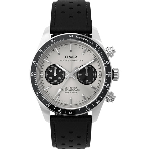 The Waterbury Heritage Chronograph combines modern functionality with timeless design, featuring a chronograph to track elapsed time and a black tachymeter bezel for determining average speed. Encased in a robust 39mm stainless-steel case with vertical brushing, the silver-tone dial is accented by contrasting sub-dials and safeguarded by an anti-reflective mineral glass crystal. Luminant hands ensure enhanced visibility, while applied indices and intricate detailing on the crown and pushers add a refined touch. Versatility is key, with a black natural leather strap that’s perforated for breathability and equipped with quick-release spring bars for effortless strap changes, no tools required.