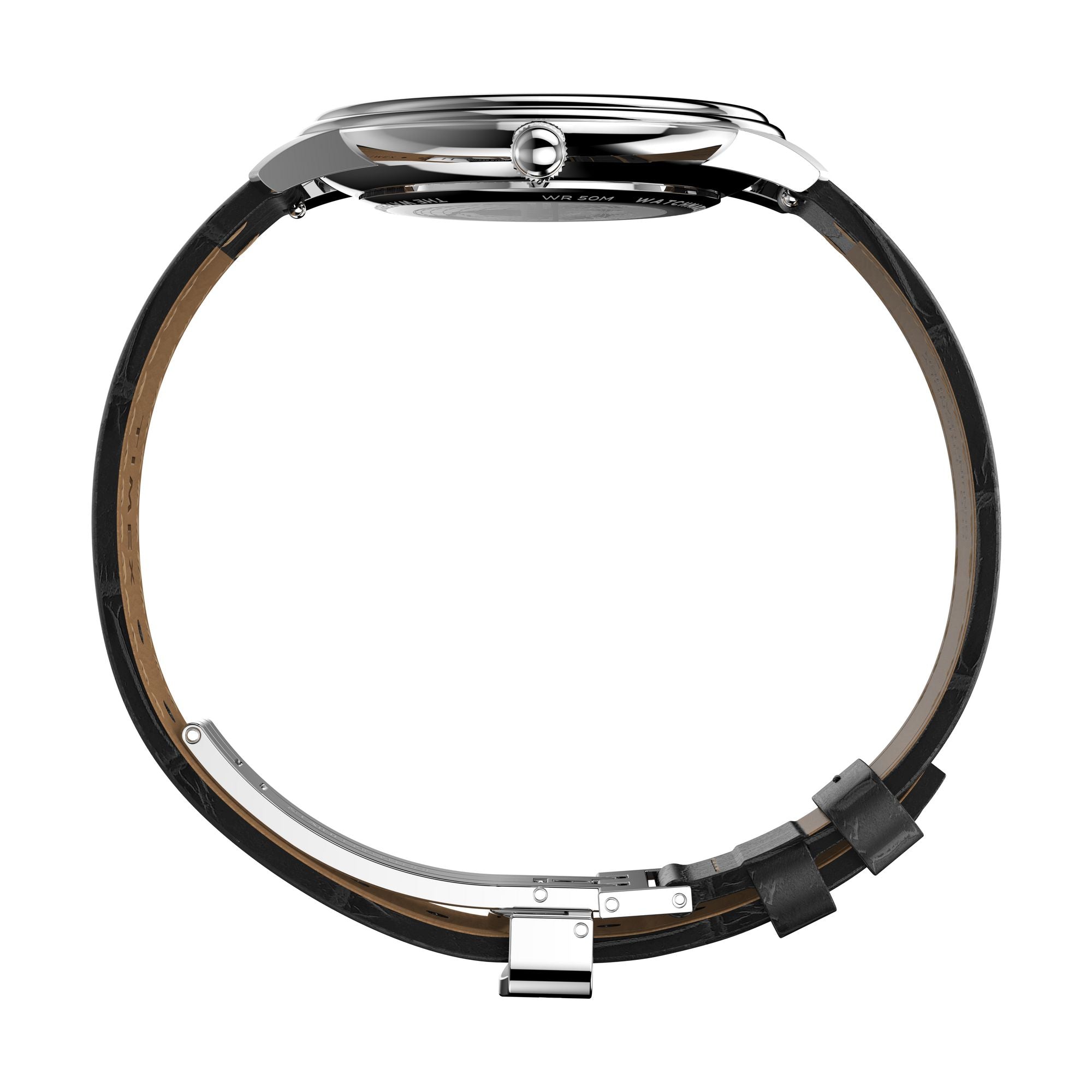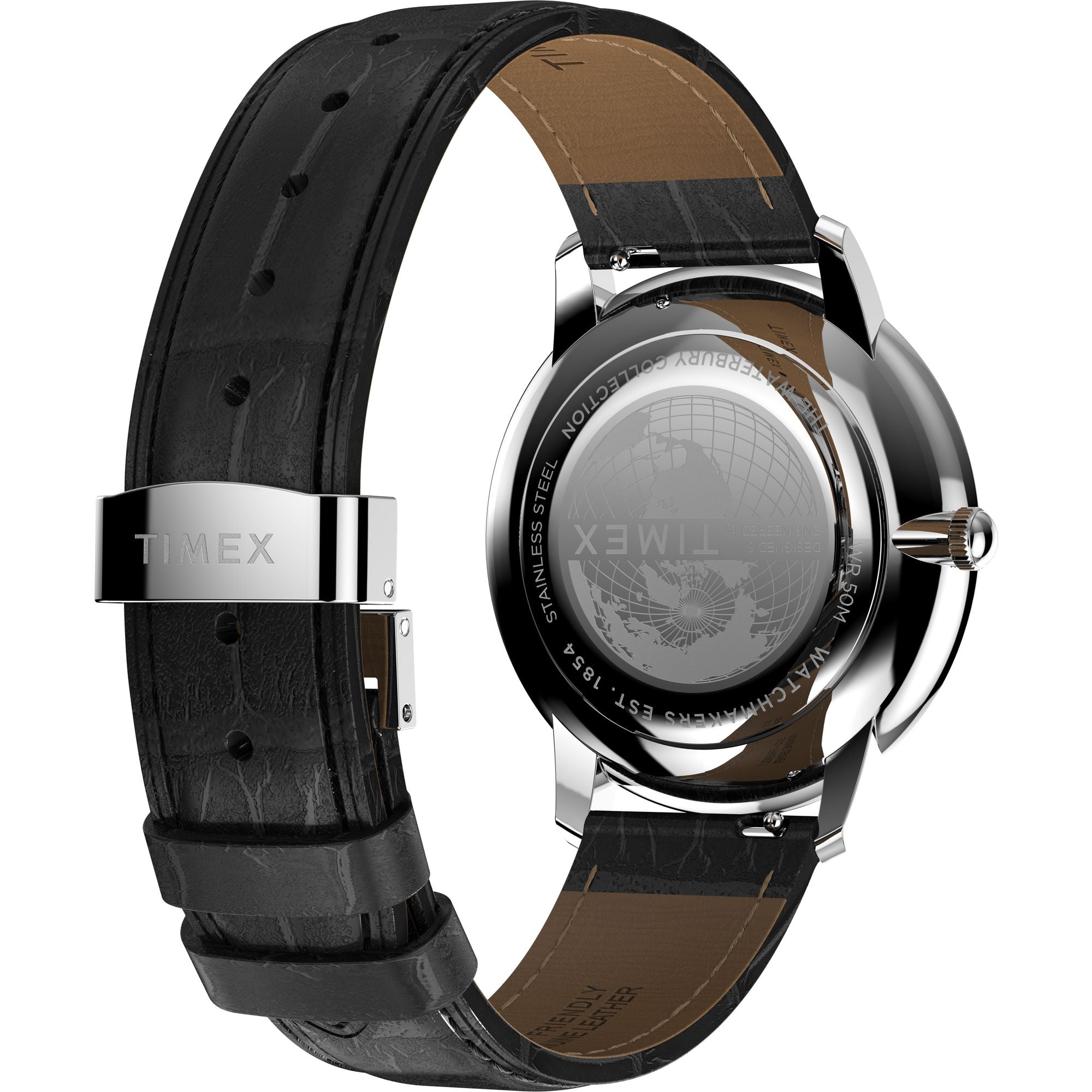 Defined by sharp lines and sweeping curves, the Timex Waterbury Sub-second features an enhanced 39mm stainless-steel case with a slimmer profile and an elegant two-tiered bezel. Encircling the silver-white dial are Roman numeral markers and a rail track, paired with a 24-hour format sub-dial just above 6 o’clock. This sophisticated timepiece is paired with a black natural leather strap ethically sourced from the Leather Working Group (LWG) and complete with an enticing crocodile grain and a deployant clasp.