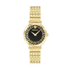 the slanting greca decorating the top ring gives depth to the dial, which is also given