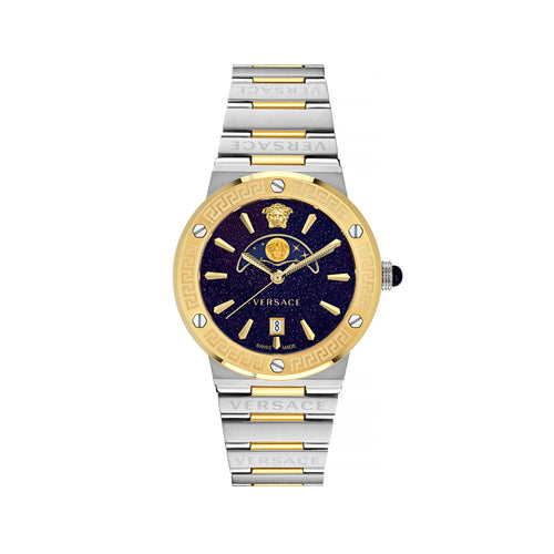 A contemporary timepiece combining geometric shapes and feminine style, Greca Logo Moonphase features round-shaped case that stands in contrast with the rectangular bracelet links. The top ring is marked by the screws and the Versace Greca motif, which gives an immediate recognition of the Brand reinforced by the Versace logo at 6 o’clock and the Medusa head at 12h. The moonphase window is visbile in the upper part of the dial, featuring all the phase of the moon in a very elegant and chic way.In the bracelet version, the timepiece's sleek design is completed by the Versace logo alternately repeated on the links.