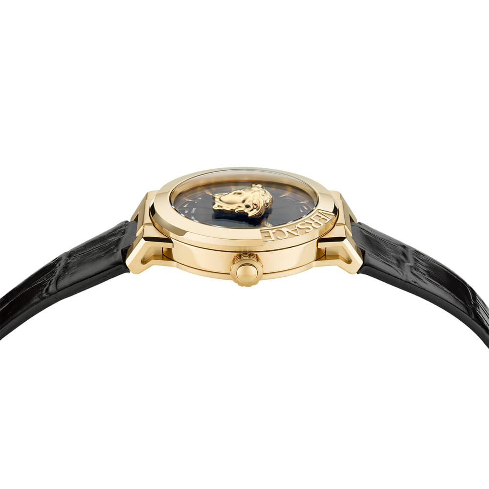 This new 38 mm cool and modern watch is executed with the bold Medusa floating on the dial that has been enriched with a metallic La Greca finish. The modern shapes of this new boyfriend case give a sporty look and feature a leather strap and subtle dial.