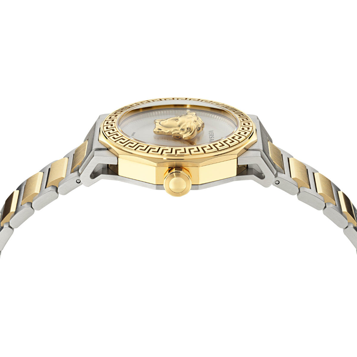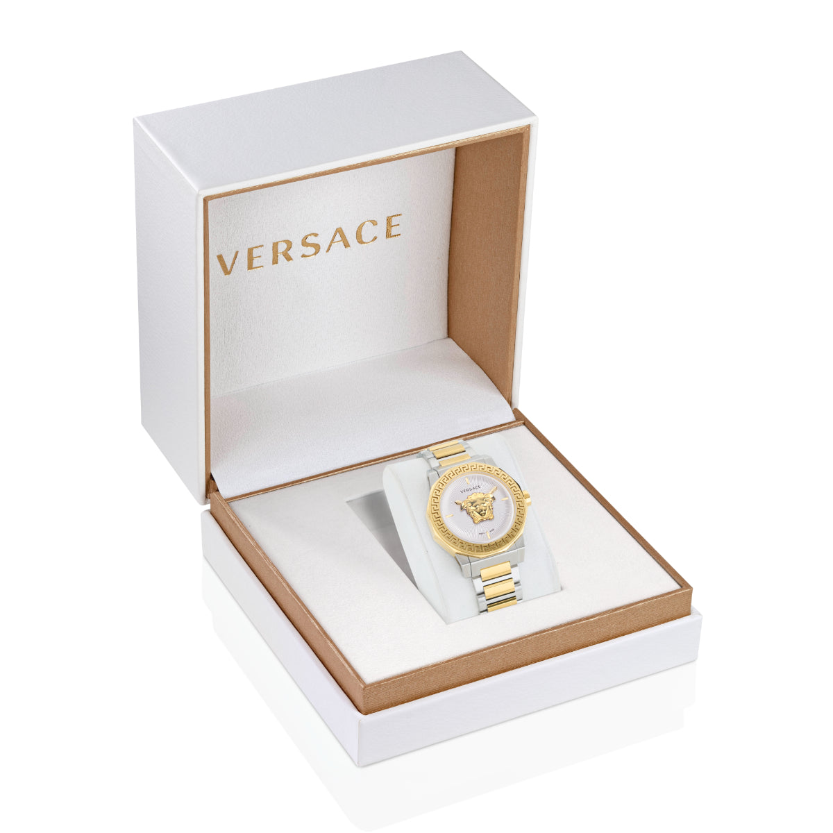 A new shaped case for a timepiece that celebrates the beauty and the charm of the Medusa floating on dial. Featuring an iconic design, this classic watch has a three-dimensional Medusa on the guillochè dial. The top ring is further decorated with the Greca to strenghten the connection with Versace's DNA.