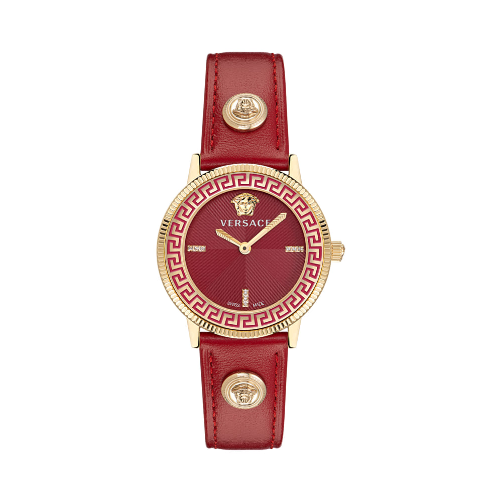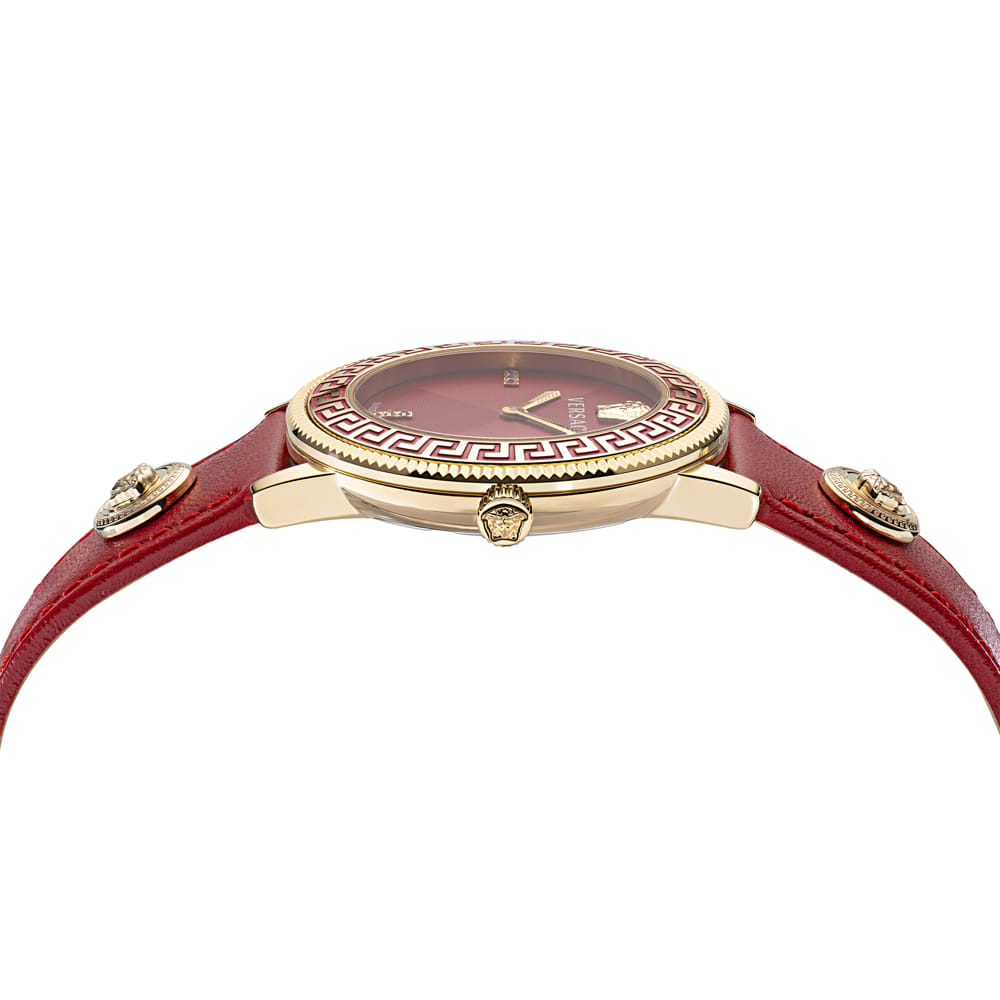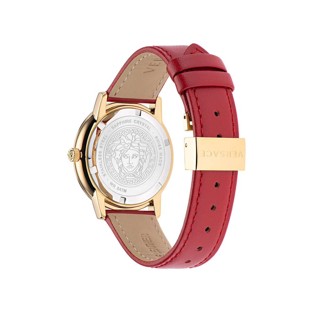 This new iconic V-Tribute collection recalls the famous patterns used in Versace accessories. The Medusa studs on the stainless steel bracelet, the Greca decorating the top ring, and the Versace patterns all give a strong personality to this watch collection and dial.